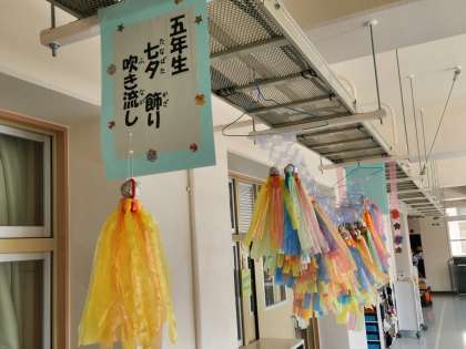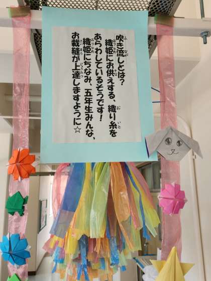 5年生の教室前の廊下に、「七夕」で使われる“吹き流し”が展示されています。