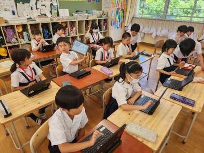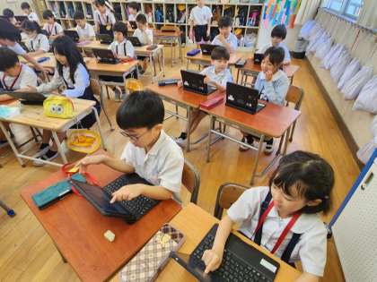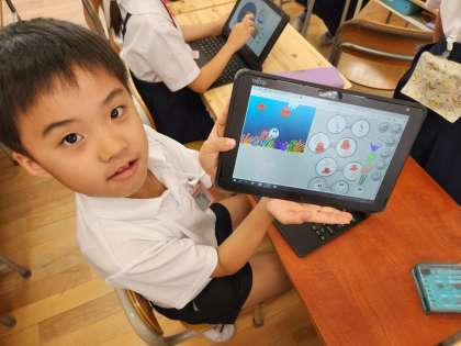 2年生が図画工作の時間、「Viscuit(ビスケット)」という子ども向けのプログラミングアプリを使って、自分で描いた絵を使って、簡単なプログラムを作っていました。