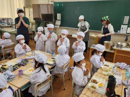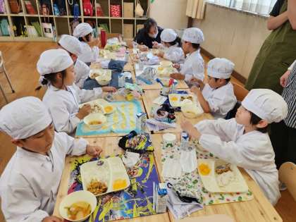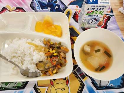 大阪市内の小学校の子どもたちが考えた「夏祭り」をイメージした献立で、だんじりを盛り上げるために、給食で夏野菜をたくさん食べて、体力をつけることができるように工夫したそうです。また、お祭り気分を盛り上げるために、彩りにも考えたそうです。