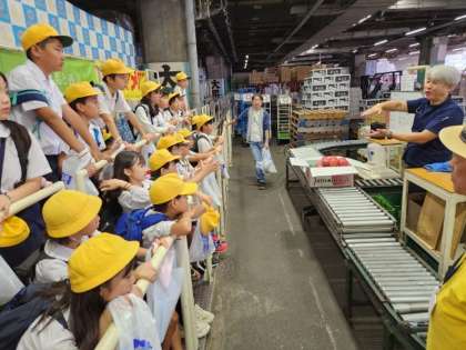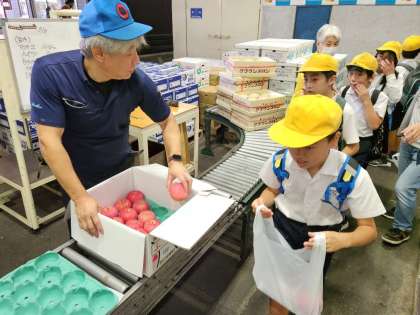 実際に段ボールひと箱に入った“りんご”の「せり」を、子どもたちに体験させていただきました。