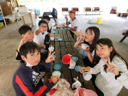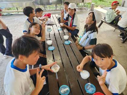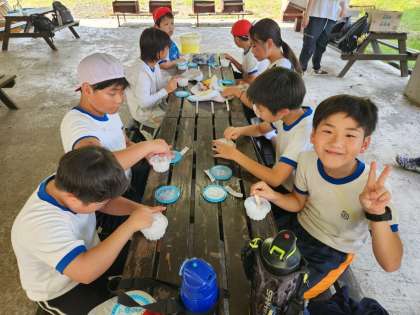 楽しかったアルプスアドベンチャーを終え、かき氷を食べて休憩中です。