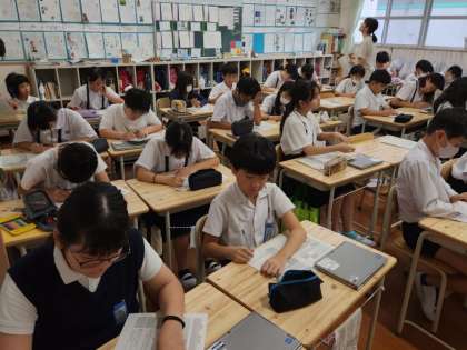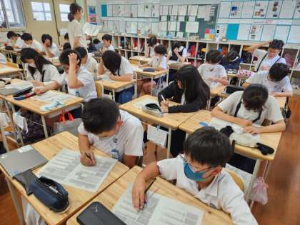 6年生の教室では、プリントやビデオを使って、「暴風雨」に対する身の安全を確保する方法などを学習しました。