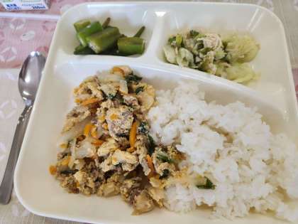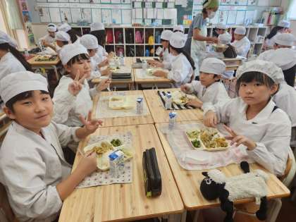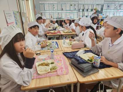 給食では子どもたちが食べやすい献立「他人丼」が提供されています。