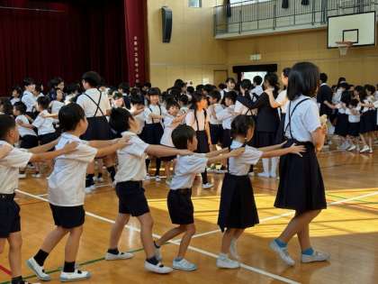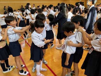 たてわり班ごとに一列に並びます。先頭の人がじゃんけんで負けたら自分の列の一番後ろに行き、次の人が先頭になります。1年生も、しっかり先頭を務めることができていましたよ。
