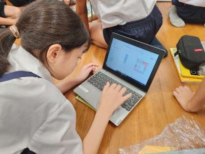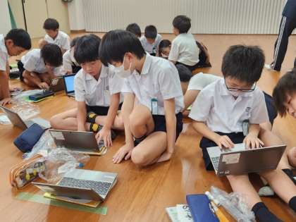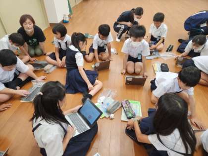 今日は空気でっぼうを使って、筒につめる玉の種類によって、とぶ距離がどのように変化するのか実験を行い、学習のまとめをタブレットに入力していきました。