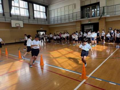 レンゲの上にピンポン玉を乗せて、落とさないように運びます。