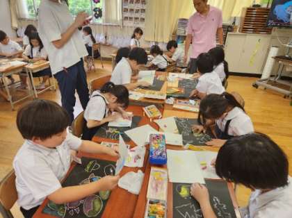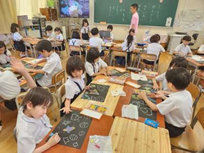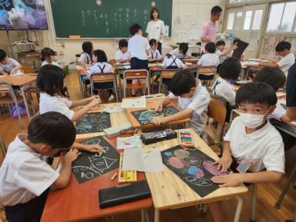 2年生が図画工作の時間に「チョークでうちゅうの絵をかこう」の制作に取り組んでいました。
