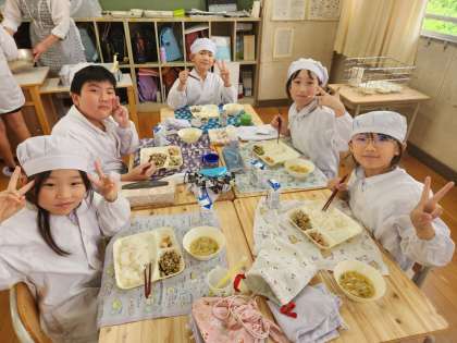 「高野豆腐のいり煮」は、子どもたちの箸がすすむ献立の一つで、豚ひき肉、にんじん、ひじきなどを混ぜ合わせて炒めたものに出汁や調味料で味を整え、粉末の高野豆腐を加えて煮たものが提供されます。