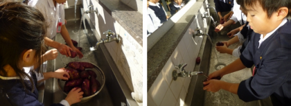 おいもパーティーに向けて,さつまいもを洗いました。