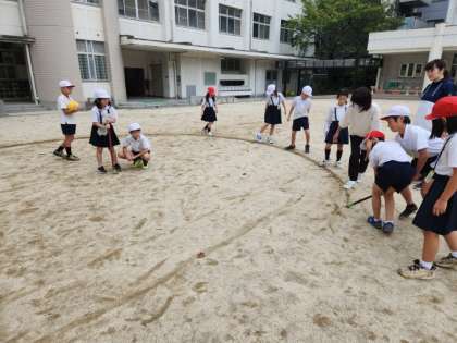 授業の最後には、運動場に大きな“円”をかいてみましたよ!