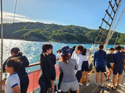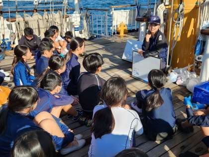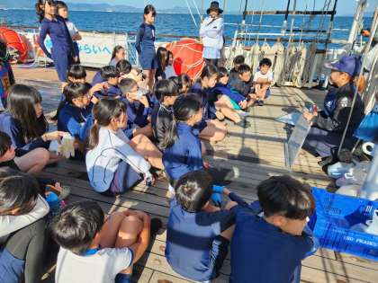 デッキで、島に流れ着くごみについて事前学習をしたあと、実際に地ノ島に行き、ビーチコーミングを行います。