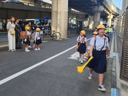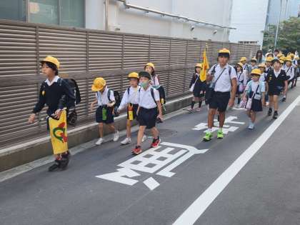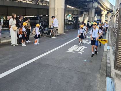 今日は修学旅行翌日ということで6年生が遅めの登校になっているため、5年生、4年生が登校班の中心となって、旗を持って班のみんなをリードしてくれました。
