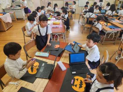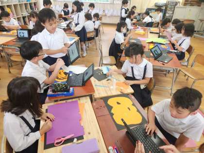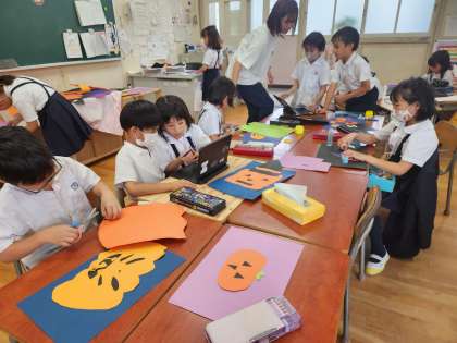 図画工作の時間に色画用紙を使って「ハロウィンのかぼちゃ」をつくっている2年生。