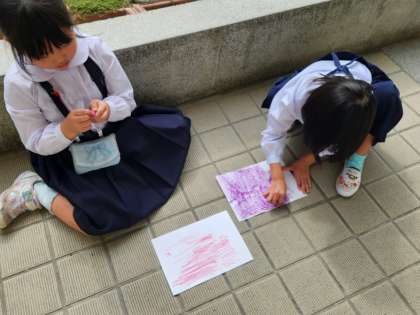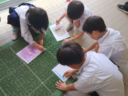 1年生は図画工作の時間に、校内にある色々なでこぼこ模様をパスを使って画用紙にこすりだし、その浮き出た模様を使って絵を描いていく学習を行います。