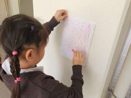 今日は、校内のあちらこちらで子どもたちが“でこぼこ模様”をさがして、画用紙にこすりだす姿が見られました。