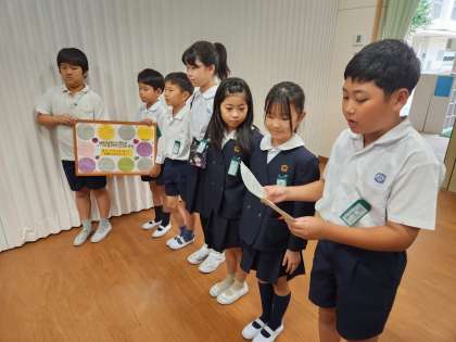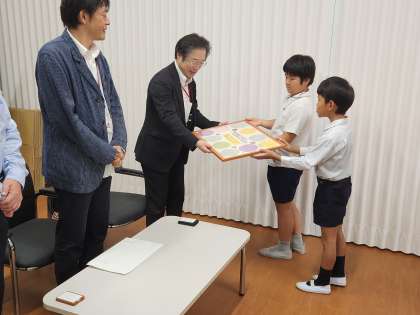 4年生代表の児童がしっかりとごあいさつをし、クラスのみんなの感謝の気持ちが込められたメッセージが額縁に入れられて、昭和設計の皆様に手渡されました。