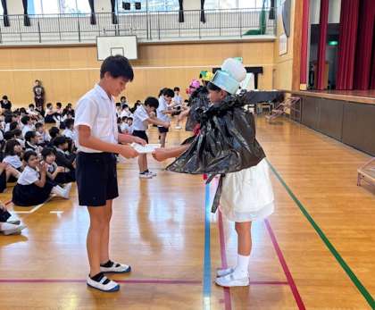 お誕生日集会の後に、あいさつ運動週間の結果報告がありました。