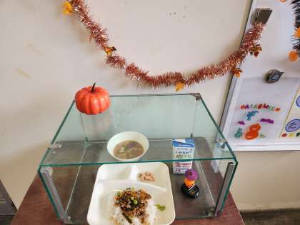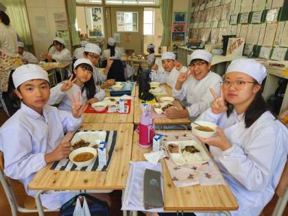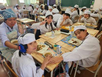 今日の給食の「ジューシー」は、豚ひき肉、にんじん、むき枝豆、もずく、切り昆布などを使ったまぜご飯風に仕上げられています。