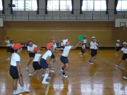 今日は、1年生と5年生が、「合体」で「フリスビードッジ」をしました。まず、5年生が、1年生にフリスビーの投げ方をていねいに教えてくれました。そのあと、赤対白でゲームをしました。