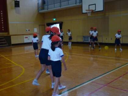 ゲーム中も、5年生は、1年生にフリスビーをたくさん投げさせてくれたり、当たった子に「大丈夫?」と優しく声をかけてあげたりして、上級生らしく接していました。結果は、8対8の同点でした。