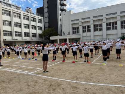 運動委員会の児童が前でお手本となり、細かいポイントの説明を受けながら、全校児童で練習に取り組みました。