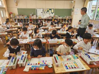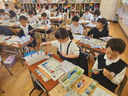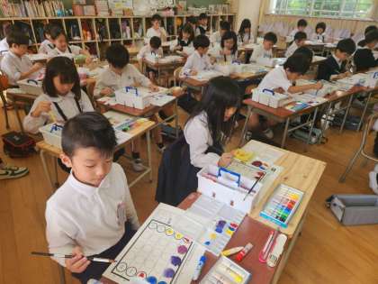 図画工作の時間に、絵の具を使う練習をしている2年生。