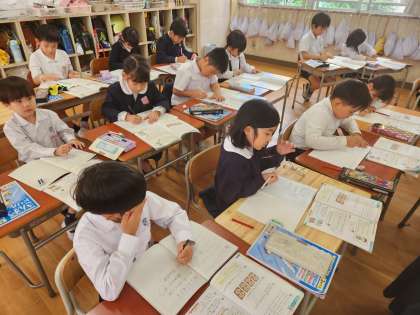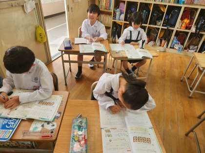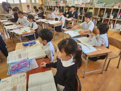 かけ算をマスターした2年生は、かけ算を使った文章問題に取り組んでいます。