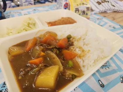 今日は子どもたちの大好きなカレーライスに、海老フライが添えられています。