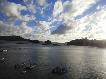 二日目の朝をむかえました。晴れています。しかし、風は強く、潮の流れも速いです。雲が、どんどん流れていきます。修学旅行の部屋から見えたこの景色、みんなの「宝物」です。