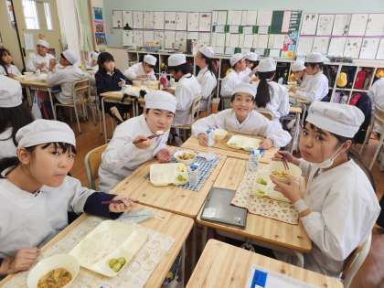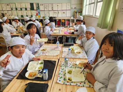 今日は、昨年度の学校給食献立コンクールで最優秀賞を受賞した献立が実際に調理され、子どもたちに提供されました。