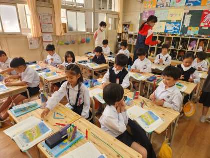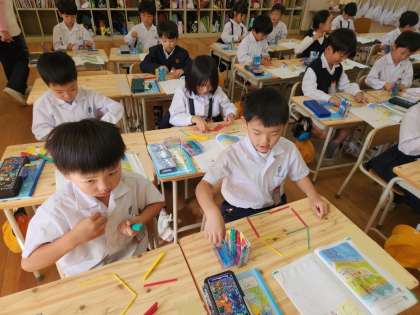 算数の時間に三角形の色板を使って「かたちづくり」の学習をしている1年生。