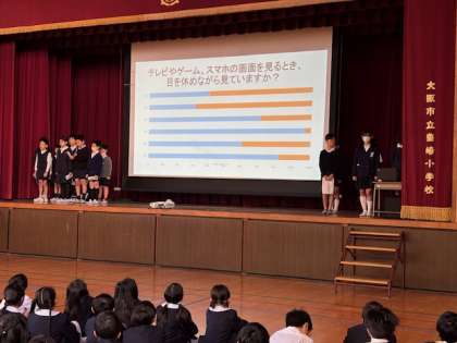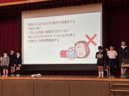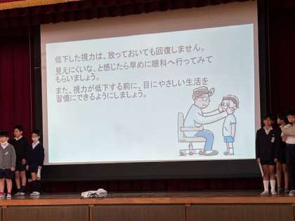 今日の集会は、健康委員会による学校保健委員会でした。今年のテーマは「目を大切にしよう」です。