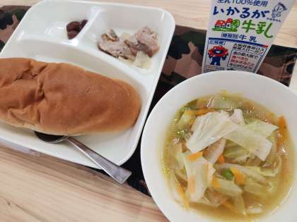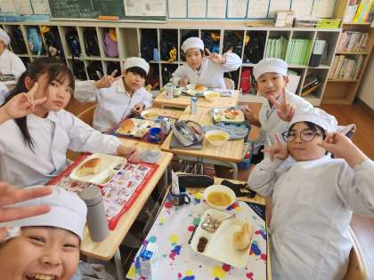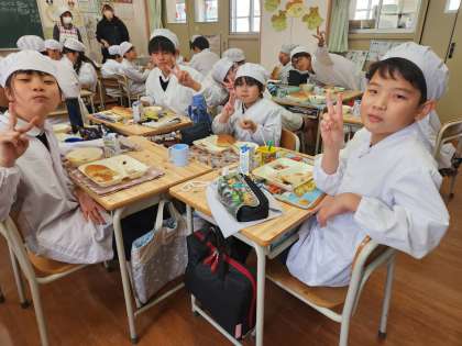 今日の給食の「うずら豆のグラッセ」は、オリーブ油を使ってつやを出しています。