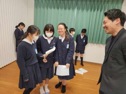 今回は吉本興業からプロの漫才師の方、作家の方にお越しいただき、表現力・コミュニケーション能力を高め、地域文化の理解、主体的に学ぶ姿勢を育成することをめあてとして、「漫才ワークショップ」を開催していただきました。