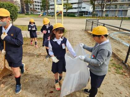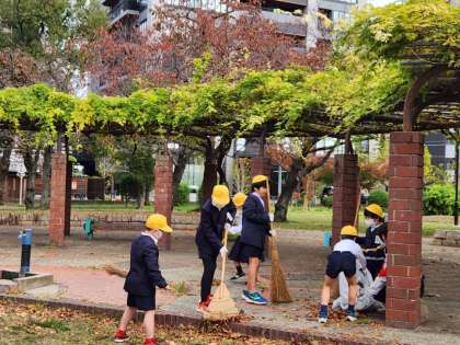 今日は地域ごとに集まって掃除をしているので、さまざまな学年の子どもたちが一つの場所を一緒に掃除しています。