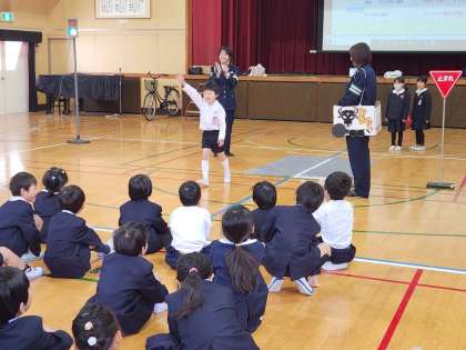 低学年には、道路の歩き方や横断歩道の渡り方など、ふだん歩いているときに注意しなければならないことを中心に教えていただきました。
