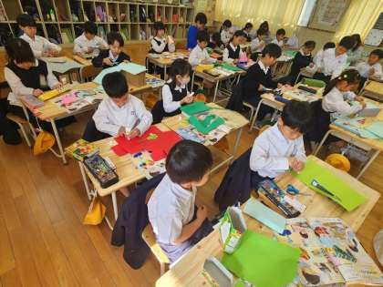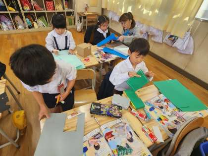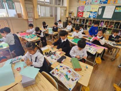 1年生は図画工作の時間に、おうちから持ってきた空き箱と色画用紙を使って、色々なものに“変身”させていきます。
