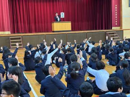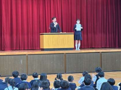 今朝の朝会では、校長先生から「親切」という字の成り立ちについてお話がありました。