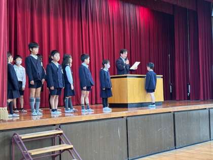 お話の後に、ギャラリー表彰と大阪市小学校児童絵画・版画展の表彰がありました。今日もたくさんの児童が表彰されました。