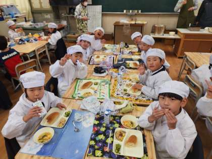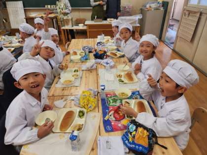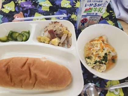 今日の給食では、焼き豚、くり、しいたけの入った「中華おこわ」が提供されています。