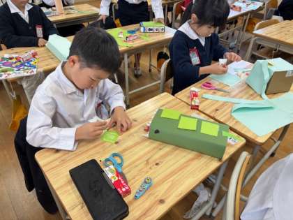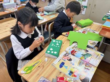 1年生は、空き箱を画用紙で飾り付けし、動物や家など思い思いの作品を作っていました。