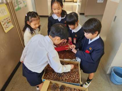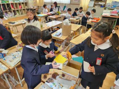 1年生の教室には“まつぼっくり”や“どんぐり”“おちば”など、たくさんの「秋」を感じるものがあります。子どもたちがお出かけをしたときに、おうちの方と一緒に集めてくれたものを学校に持ってきてもらったものです。