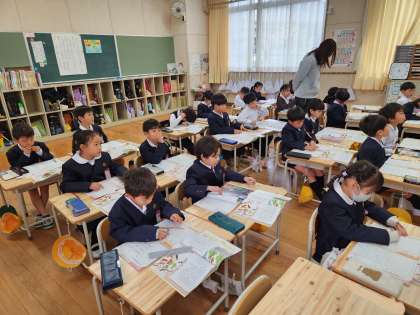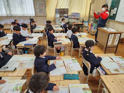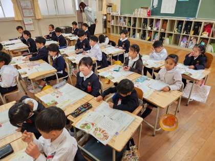 1年生は道徳の時間に「二わのことり」というお話を学習していました。