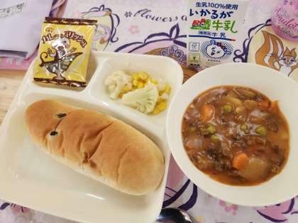 昨日の献立はホワイトソースのクリーム煮でしたが、今日はブラウンソースの「ビーフシチュー」がメインのおかずです。あたたかい献立が続きます!