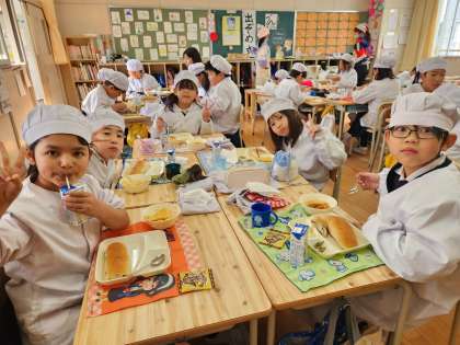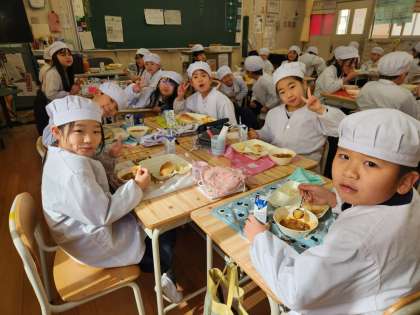 今日の給食時の様子は、3年生の社品を使っています。