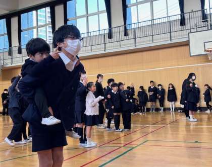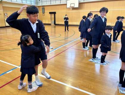 高学年が、低学年の子を支えて小さな新聞紙の上に乗る姿がなんともほほえましかったです。