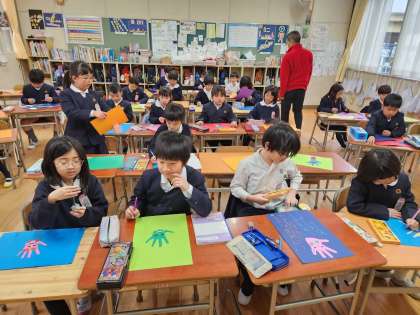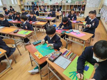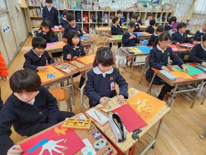 図画工作の時間に、自分の「手形」の模様を使って制作活動をしている2年生。