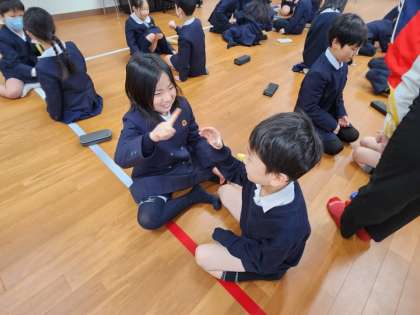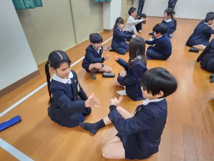 「遊び」の時間には、ネパールで行われている「魚とカエル」という遊びをみんなでしました。日本の“ゆびずもう”とよく似た遊びです。