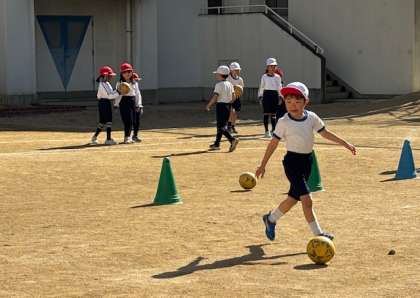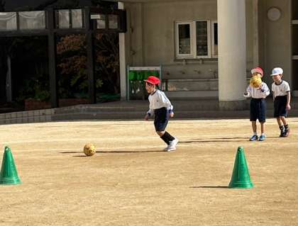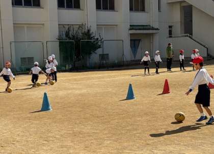 コーンの間をうまくねらってボールを蹴ります。だんだんと、みんなねらった所にボールを蹴ることができるようになっています!