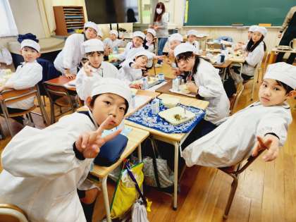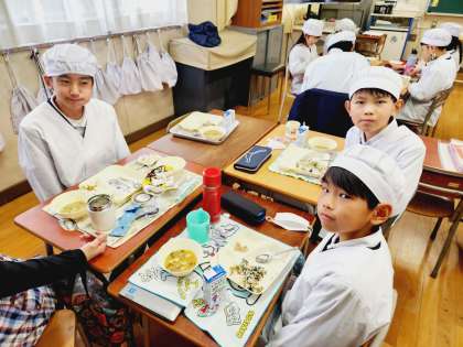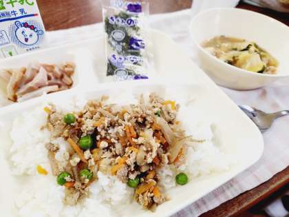 「鶏ごぼうごはん」は、鶏ミンチ肉にごぼうやにんじんなどの野菜と合わせて炒め、出汁を加えて煮込んだものを、ごはんにかけていただきます。食べやすくて、子どもたちから人気のある献立の一つです。